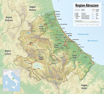 Im Norden grenzen die Abruzzen an die Region Marken, im Westen an das Latium mit der Landeshauptstadt Rom und im Süden an die Region Molise. Im Osten liegt der 150 Km lange Küstenstreifen mit seinen vielen breiten Sandstränden und kleinen felsigen Buchten an der Adria.